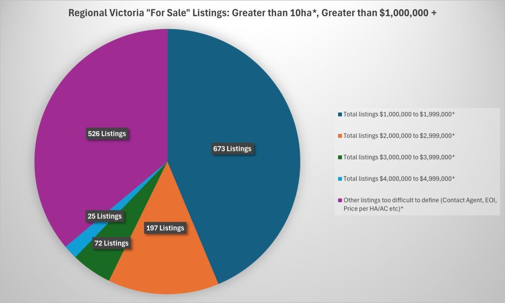 For example, if you’re a buyer in Victoria with $1,000,000 plus to spend on a property greater than 4 hectares (10 acres in the old money), you’ve got 1,457* properties to choose from!